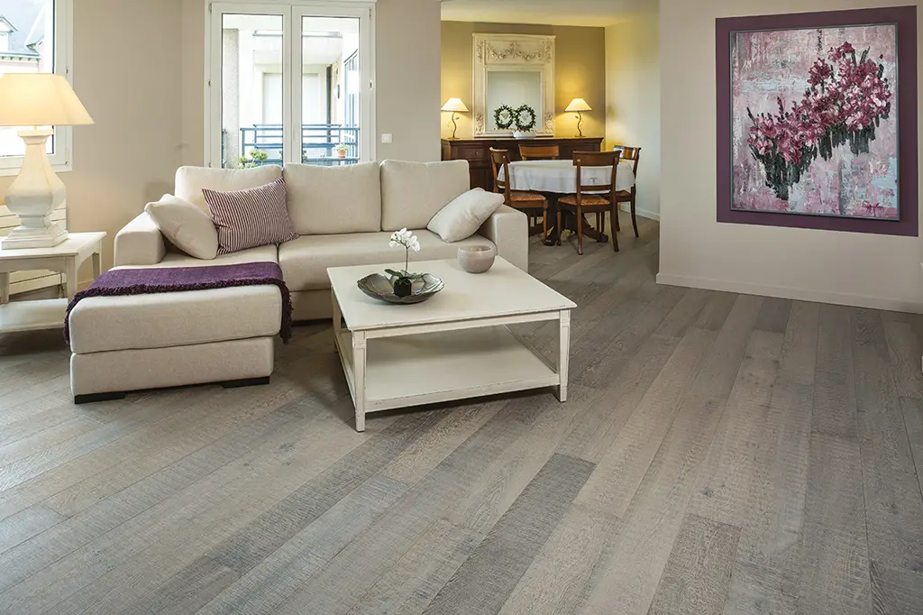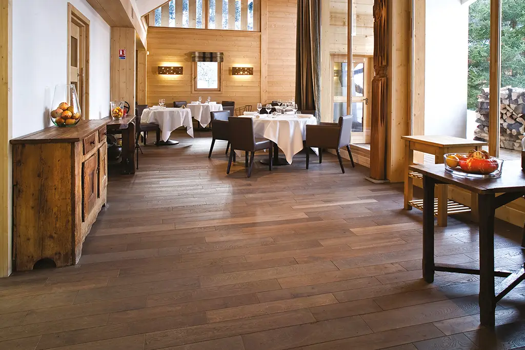Parquets vieillis, sciés, brossés, structurés et finitions exclusives maison.
